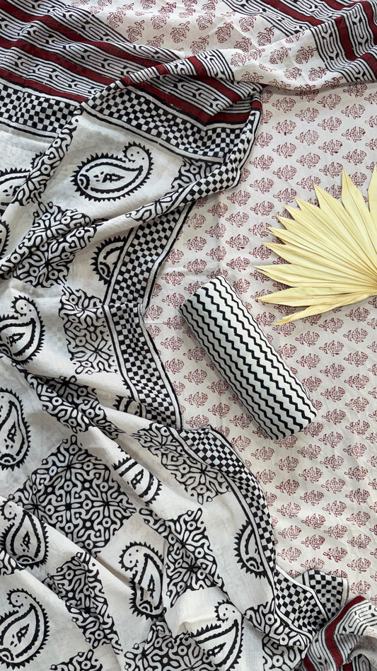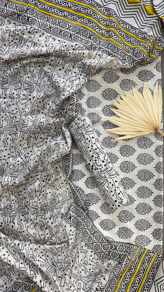 Soft Block Printed Mulmul Cotton Saree (BLACK & BEIGE)