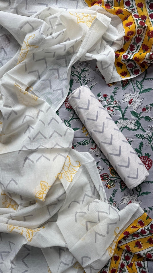 Soft Block Printed Mulmul Cotton Salwar Suit with Dupatta (GREY MULTICLOUR)