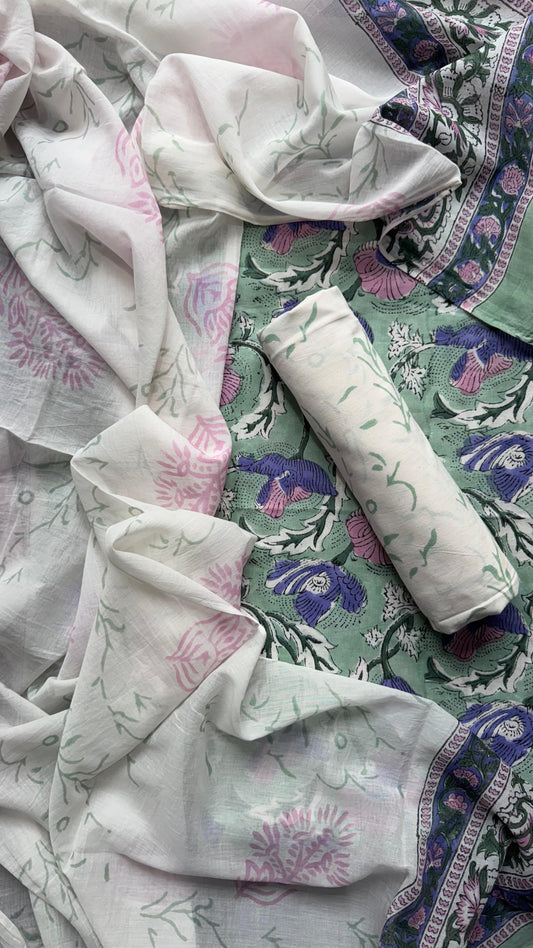 Soft Block Printed Mulmul Cotton Salwar Suit with Dupatta (PASTEL GREEN)