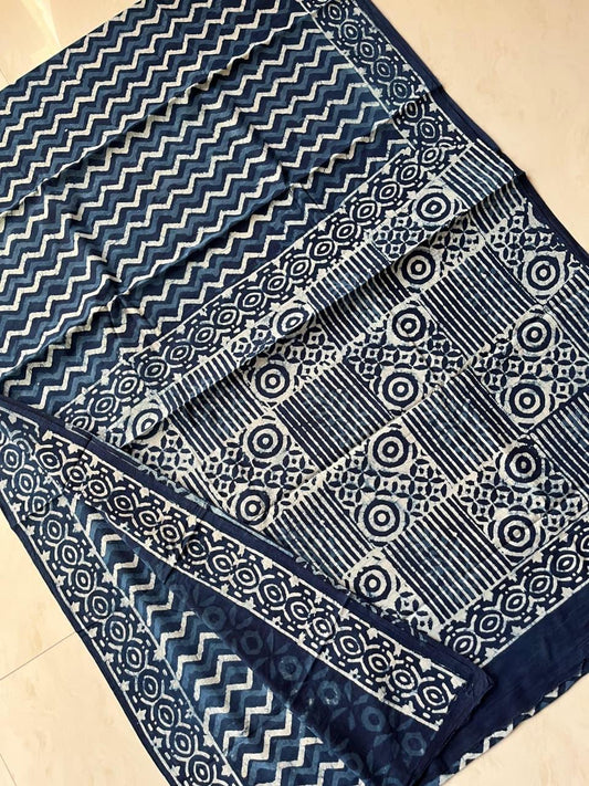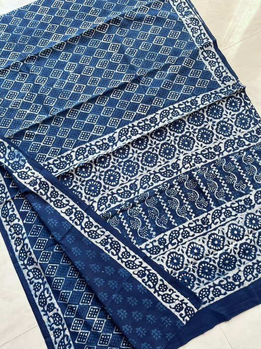 Soft Block Printed Mulmul Cotton Saree (INDIGO)