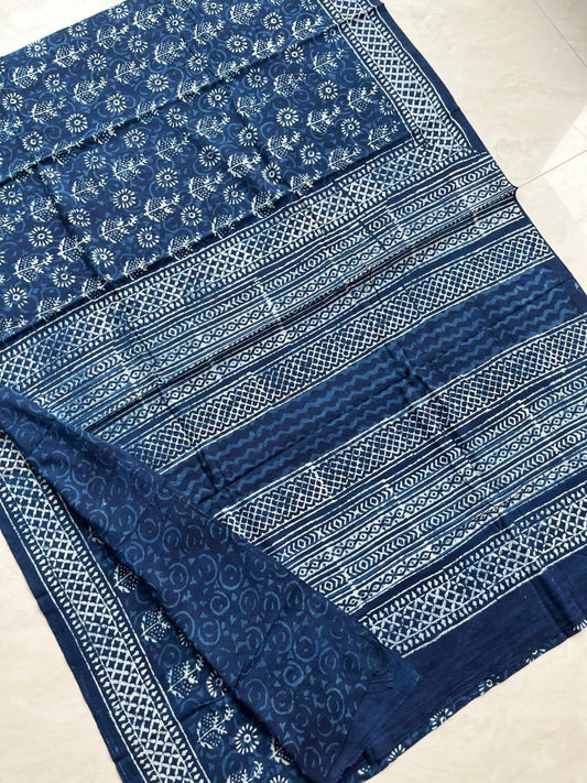 Soft Block Printed Mulmul Cotton Saree (INDIGO)