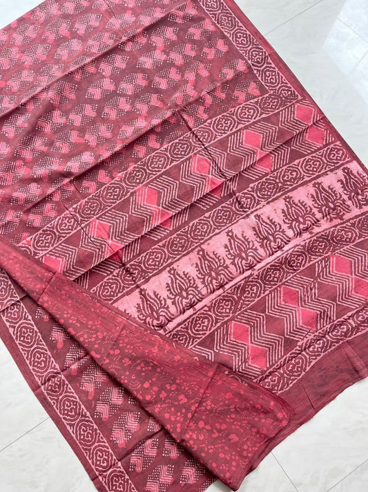 Soft Block Printed Mulmul Cotton Saree (BEETROOT RED)
