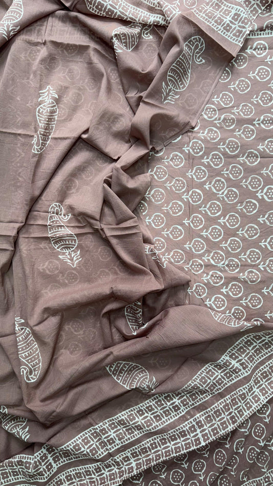 Soft Block Printed Cotton Salwar Suit with Mul Dupatta (MUSHROOM BROWN)