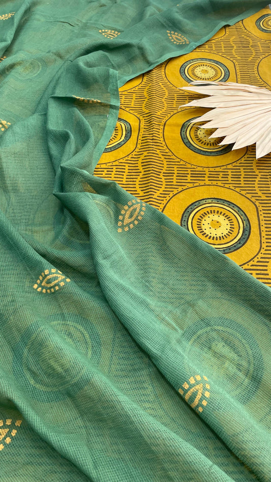 Mangalgiri Cotton Salwar Suit with hand crafted Dupatta (GREEN & LIGHT ORANGE )