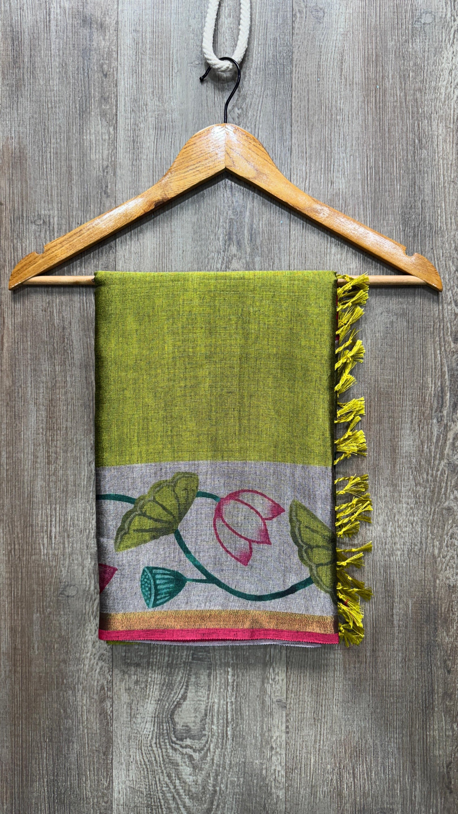 Semi Tussar Printed Saree with Zari Border (MEHENDI GREEN)